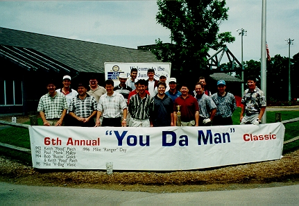 Top Ten Things overheard at the 1997 "You Da Man" ________________________________ 10. Win if you can, loose if you must, but always cheat 9. Starter: "Who's in charge here?" 8. Monk - for gold ball: "Seven on this hole. Seven on the next hole What the Fuck's the difference" 7. If your not cheating, you're not trying hard enough 6. It's not going to make my highlight reel. 5. 1999 is my year. (Chris) 4. You can't ZOOM the bouncer!!! 3. Our job is done here (Monk) 2. If you can't keep it down you will have to leave the building! 1. SSSSSSHHHH!!!! ----------- Others: 11. I'm getting used to my putter (Monk ???) 12. I'm not with them by the door ( Tom ??) 13. Did you see what went flying out there (Mike losing club head at the driving range) 14. He's a marine, I have to respect that Semper Fuckin Fi 15. It's a no stickey night (Regarding Paul's mishap) 16. I still have my receipt for the shoes... ...They don't work (Larry Day) 17. Ouch! My neck hurts (Mark Dille)