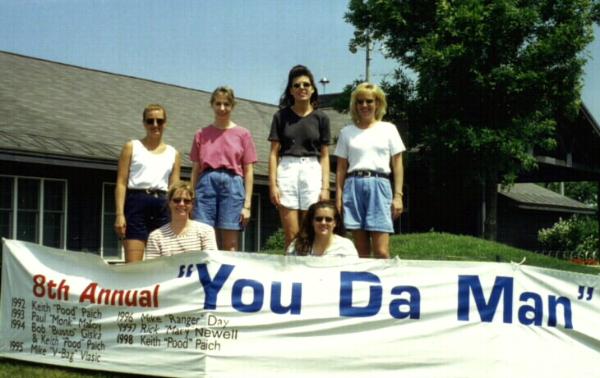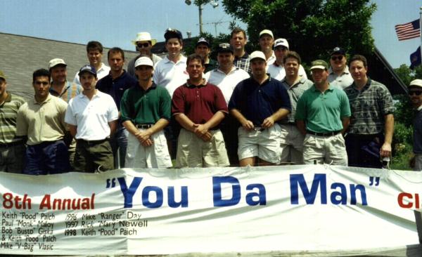 The 8th annual You Da Man was yet again a tremendous success. The weather was great, the food was great, the beer was plentiful, and the golf wasn't too bad either. But all of these things combined take a distant second to the camaraderie enjoyed by good friends. When I tell friends in other circles what we have going here, they are amazed. They are actually envious, for they have nothing like it to compare. Some of us only see each other once a year, but it's as if we all were still back in college. We have to keep it going. What's this? T getting sentimental? T getting soft? NOT!!! ---------------------------------------------- Every year a lot of interesting exchanges occur between the attendees at You Da Man. Sometimes it's difficult to remember the tidbits from conversations, and funny situations over a three day period. I think it's because we have fewer and fewer brain cells to work with as each year passes. However, with a lot of help, we always manage to collect enough quotes to permanently record some of the memories. But how do you determine the top ten? It's simple really. The top ten committee meets at least one week after the You Da Man weekend to read over the quotes. Chuckle meters and other scientific devices are used to record the committee members response to the quotes. And the rankings are made. Among the noteables this year include: "Get away from me Freddy or I'm going to lay you out" - Joe Shiber after threatening remarks from Freddy. "Check out the new stainless walls at the gaff" -someone to Monk. "That's so they can wash the blood off easily" - Monk's response "Hey there's sand" -Sluz , sarcastically, after finding himself in a bunker on the blue course. Obviously referring to the disappointing condition of the White Course bunkers. "Hey there's sand"-Sluz again after hitting in his second bunker on the Blue. "Hey there's sand" -Sluz again, and again, and...How many bunkers were you in anyway? "Nobody wants to do after hours this year." -Beth lamenting to T early Saturday evening. -"Who doesn't want to do after hours? That's now at 7...at 2 AM everybody will say yes"-Exasperated response from T. "I thought it was next weekend" -Nosal after showing up Saturday 15 minutes before tee times. "If the police showed up then they should have a lifetime exemption to You Da Man" -Ace commenting on the incident outside the Gaff. ------------------------------------------------------------- And here it is! Hopefully with plenty to offend everyone. From the home office in State College, PA ... the Top Ten things overheard at the 1999 You Da Man weekend: _______________________________________ THE TOP TEN: -------------------- 10. "Mulch, you won't have a net 95 on Saturday" -Pood to Mulch after reviewing his surprising score on Friday at the White course. 9. "Busto, this green is slick...It's like putting on marble" -Pood to Busto before he hit his 20 foot putt only 7 feet. 8. "Our team was sta... I mean smokin" -V-Bag to T and Dano while excitedly explaining how his team won all the team events on Friday at the White course. 7. "How does the zoom lens on the camera work?"-Mulch's wife Cindy to anyone listening while taking the Babes group picture in front of the banner. Beth's response: "Take two steps forward". 6. "I was either under trees or digging holes for trees!" -Monk explaining his round to Pood. 5. "She was still drunk on the ride home" -Champion Sluz to Pood referring to wife Julie. 4. "New rule: NO TEQUILLA!!!" -Rules committee on Thursday night. 3. "Monk, do you get arrested throughout the year while here at Penn State or just when we show up for You Da Man?" -Rick's greeting to Monk on the first tee on Friday. Monk was later heard muttering: "He didn't even say Hi first". 2. "Chances are if she (Julie) would have seen your ass, she never would have asked you to dance!" -Leslie to Monk ( About mooning Sluz). 1. "Men gravitate to my wife" -Champion Sluz to Rick at the Gaff. --------------------------------------- And now for some stories, too long for quotes, but too funny to leave out: ---------- *As told by the champion, Sluz, a quote not spoken: As Todd was getting ready to tee off on #3, I was going to tell him that it was possible to hit the water tower with a bad shot. I decided not to tell him so he would not be thinking about it. He had a great drive down to the bottom of the hill. I promptly stepped up to the tee, pulled a drive to the left, hit a tree, then heard a loud boing. ( I may have double bogeyed that hole but, oh, I still won). ---------- * As told by V-Bag: I don't know if there was a printable quote in there somewhere, but "Sluz Da Man" used each and every curse word known to man after 3-putting #12 from 8 feet. He then proceeded to throw his club, smash a cup of water against the water cooler, and soak our two guests (Todd & Joe) in the process. I was relieving myself at the time, and when I returned I inquired to Sluz whether or not he made the putt. To this question he screamed every curse word once again. (The sad thing is...he STILL WON!!) ---------- *As told by "You Not Da Man" Mulch: We were all down in the Skeller after that fateful saturday on the Blue course. Everyone was replaying their favorite holes...where they missed that critical putt...where they were when Sluz Da Man hit the water tower..(I was on the Grassy Knoll). I was holding my favorite pitcher. Ace asked how the rest of the Mulch foursome fared. I said that everyone except for T had added 10 strokes to their game from Friday. I said that I thought my poor play may have affected the others in my foursome. To that Ace laughed and said: "You Not Da Man is a cancer to his team...first he infects your swing...then he infects your chipping... then your putting...until it's all over!" ---------- *Also told by"You Not Da Man" Mulch: Sunday morning 9:31 am in room 221, Julie slid out of the bathroom and plopped down on the bed next to Sluz Da Man. The room was pitch black in k