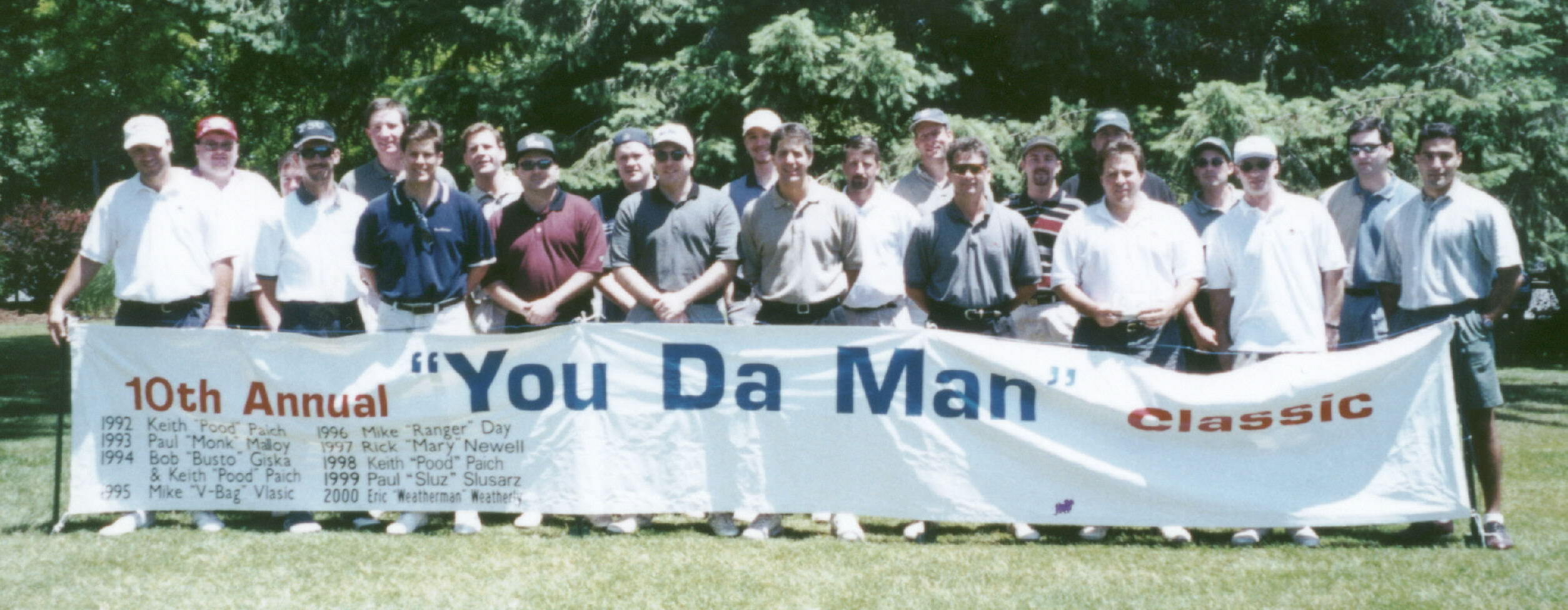 "Top Ten?...(or less) " 2001 "You Da Man" _______________________ 10. 9. 8. Anonymous: "I don't see John getting any better. He'll always be in the running for the pitcher." 7. Proposed Rule Changes: "Must be drunk Thursday night to qualify for YDM" {YDM that haven't been at rules committee: Pood (3 times) , V (2 times) , Sluz } 6. Dano to Dille: "I wish I golfed as good a game as you talked" 5. Clayton: "Thanks for the new shoes guys!" (After shooting a 75 Fri & 78 Sat and winning all the money) 4. Weather on White #13: " I wouldn't lay there if I was you" "We're going to hit." 3. Jim to Busto: "Are you in the trap?" Busto: "No, not yet!" 2. Waitress at Ye Old College Diner: "Can I smell that?" (Asking to examine the contents of Michelle's ½ yard of beer which she claimed to contain apple juice) 1. Ace: " I was a victim of the structure" (Ace explaining away another failed effort to claim the cup)