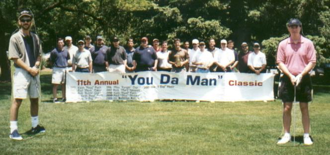"Top Ten or so" 2002 "You Da Man" ____________________________ 16. Sluz: "I didn't know who I was rooming with when I got here. I just told them - whoever lost Friday's round would have to sleep with me." Michelle: "I'm glad I didn't golf Friday" 15. T (at the Skellar poolroom Thursday night): "Dano and I can take anybody in this room." (He repeated it more than 15 times) 14. Mike Smochek: "You know you can get that stuff in South Korea" he said to the hot girl in the white dress when she asked him about the Saki. (He could have told her about the bottle of Saki in his room) 13. Overheard at the Gaff Friday night: Pood: Ace...who are you golfing with Saturday? Ace: The losers Val: That could be anyone. 12. Yonnie (on 15th tee): "Monk. How are you doing?" Monk (on 17th tee): "It's too early to tell. There's still a lot of golf left." 11. T takes 2 strokes to get out of the sand on 18 as the gallery watches from behind the green. Then he carefully rakes his tracks. Michelle: "That's the most yard work I've seen him do in years" 10. After over indulging Thursday night, Ace was asked how he slept: Ace: "It wasn't so much sleep as it was monitoring my bodily functions." 9. Conversation overheard after a Weather Quake Someone: "Hey Monk, how many times you grabbed a guys ass?" Monk: "You mean tonight?" Monk: "I felt Eric's ass...that was enough for me." 8. Mike a.k.a. 2002 You Not Da Man at Saturday night after-hours ... still drinking out of the pitcher...notices Michelle not drinking out of the half yard anymore. Mike: "Why aren't you still drinking from your half-yard??? I'm still drinking out of the pitcher! Michelle's response: "Because I don't have to. I was not doomed to wear it and drink from it due to some sort of failure of mine." 7. Ace had gone 2 days without a par. Someone: "He might go all summer without a par" 6. Weather's drive lands 30 yards off the first tee. Eric Smochek: "The pitcher's coming back to Dormont!" 5. Ace on #1 Blue: "It's airborne" Someone's response: "I don't give a fuck" 4. Monk (after 9 holes on the blue course): "Sluz...I Suck" Sluz: "What's your handicap? Monk: "23" Sluz: "23 divided by 2=11 ...50-11=39... Yeah. You do suck" 3. Monk: "I don't hit it far enough to get in trouble" 2. Slusarz trying to convince Dan & Val not to leave after-hours: Slusarz: "Don't leave! We only do this once a year! ONCE A YEAR! Come on!" Michelle:(to Sluz) "We actually do this twice a year. We just don't tell you about the other time." 1. Overheard during a Weather Quake on V Monk: Where's V? Weather: I don't know! Monk: I think he's on top of us Weather: How the hell did he get on top of us? Monk: I don't know?