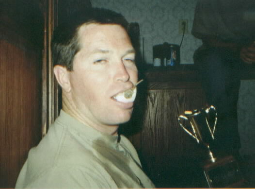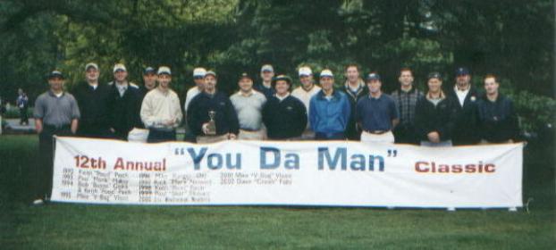"Top Ten or so" 2003 "You Da Man" ________________________________ 13. Val: "Can you say Fuck any more times in that sentence?" (To Monk after a profanity laden remark.) Monk: "Fuck the fucking fuckers." 12. Dave informs T that they were not going to allow carts on the course due to the rain. Michelle: "It will almost be like a real sport if you have to walk and carry your clubs." 11. V: "Monk, that beer is good for you." Monk: "I know. It keeps me young.. like formaldehyde" 10. Chris V. "It's nice to be able to walk around campus at 2 a.m. with no problems." Mike Smocheck (after a long pause looking like he was recalling a memory) : "Yea, it's not like you have to worry about getting anally raped." 9. Clayton (to Dave after collecting $35 for yet another skin) : "It's like taking candy from babies." 8. While the bachelorette drinks from the YDM Cup, Monk holds her iced tea. Dave: "What did you do, trade her cups?" Monk: "Yea, but if she tries to leave with it, I'm killing her." 7. Dano to Dave: "Drink for thinking." 6. A Gaff waitress walks into the girls room, reeking of fresh ink, as the last of the markers is put away after marking up the walls. Waitress: "I'm supposed to throw out whoever writes on the walls." Da Babes: "We were only putting on tattoos." 5. After hours, Sluz spilling beer on the bed in the Windsor Suite Eric Smocheck: "Sluz ! You're getting beer all over the bed ! I have to sleep there !" Michelle: "Be glad it's beer and not pee" 4. Dave (on White course after getting an '8') : I was on the right, but not in trouble on the righ....until I swung the club." 3. Dano (to Mark on #3 tee): "If you offered me $1,000 or par, I'd take par." 2. Melissa (Yannie's Girlfriend) : "It's not that I want to eat her out so much, it's that I want her to eat me out." 1. The high score from Friday's round, between Pood, V, and Jimbo, was being used to determine who had to room with Sluz. Sluz (to Pood after he blew up on #4) : "Do you want the bed by the window or the bathroom?"