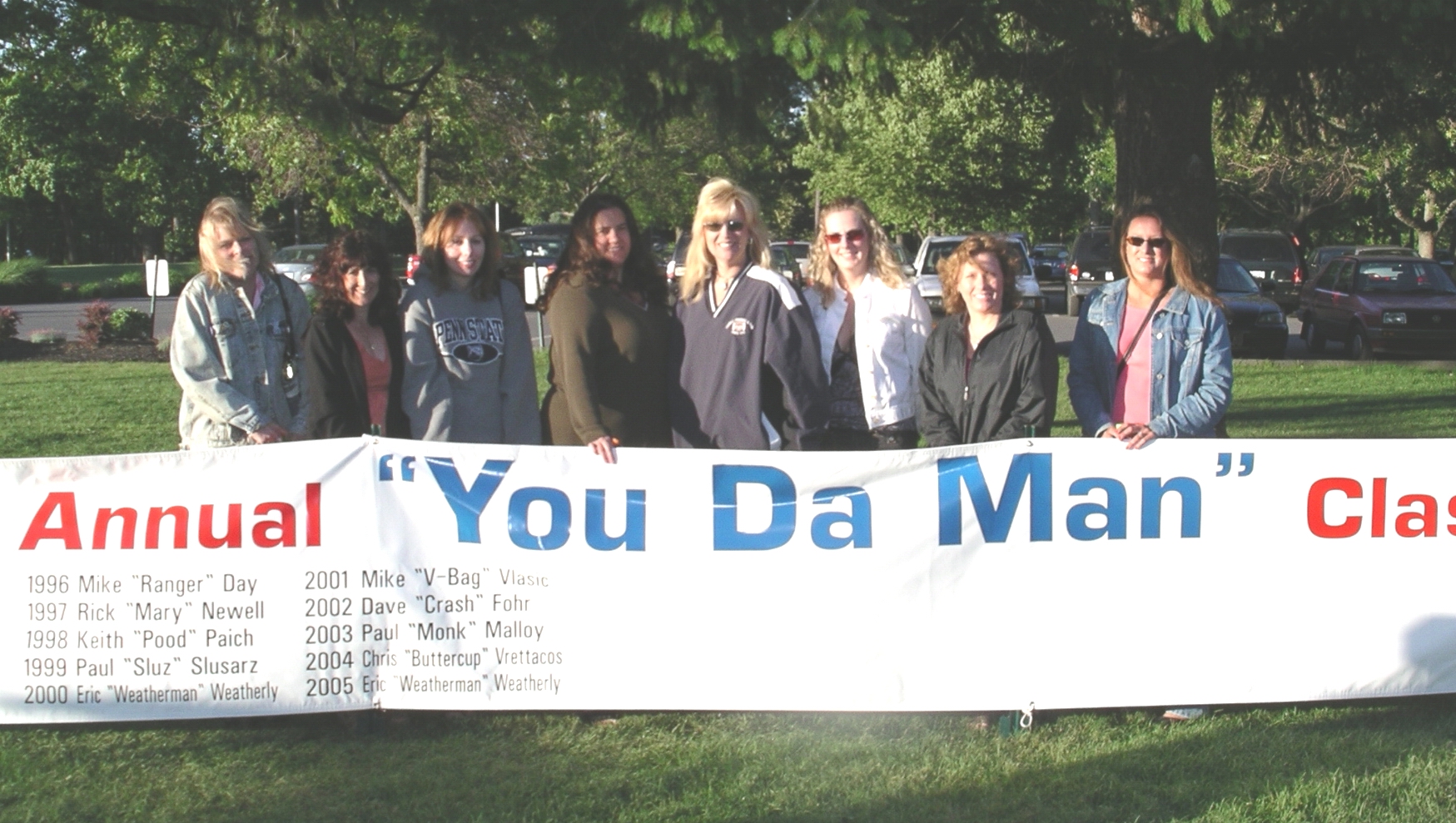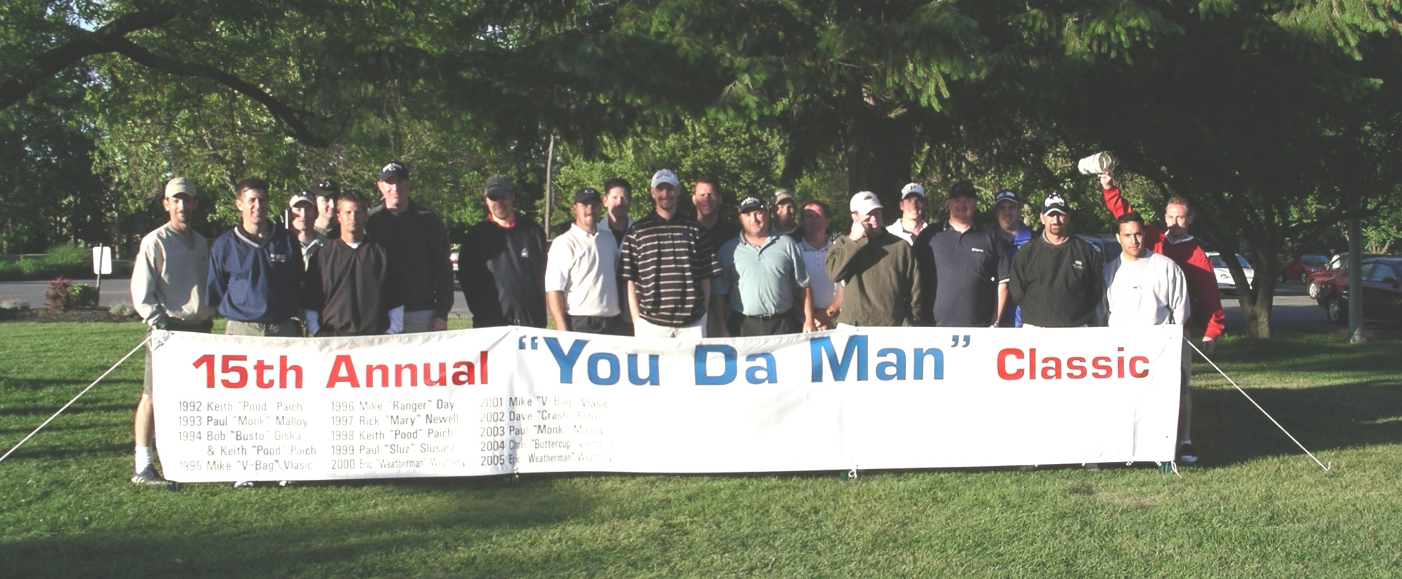 2006 "You Da Man" Top Ten...or so _____________________________________ 14. PJ to Daryl: "If I were Gay, you'd be the man!" (3:20 AM Sunday...with a lot of enthusiasm) 13. Val to Melissa: "You have really great posture." Melissa's response: "I have a rod in my spine." 12. Sluz to Jimbo: "The only quotes I have are about Mulch". Jimbo: "That's a quote". 11. Ace: "The hell with the club doing the work. I'm doing the fucking work from now on". 10. Tom (to waitress as we are being seated at Highway Pizza): "We want to order in small groups rather than one group of 20 because you always screw up when we do that. I've been dealing with incompetence all day!" 9. Sluz to Julie & Mulch: "First one in the shower has to clean up the chunks." 8. Julie to Daryl: (After numerous guys get the '+++' mark at the gaff) "I see you got the mark of the DumbAss too!" 7. Daryl to Dave: "The clubs weren't the problem, I didn't have a water wedge". 6. Sluz to Mulch: "Mulch. sooner or later you will win 'Da Man', but there will only be 4 players left." 5. Daryl to Sluz: "I apologize, I'm about to do the drop down on your wife". Sluz: "That's OK". 4. Heidi to Monk: "So tell me something about yourself that's not related to alcohol". Monk's response: "............................................ 3. Weather asks Mulch: "Where are you going?" (as he was leaving after hours at 3:30 AM) Mulch responds: "Shandygaff" 2. Mulch: "I am sick of making bad shots." Sluz: "Everyone makes bad shots...It just happens to you more often." 1. Thursday night: Monk Weather & Ace discussing the fact that Ace & Weather didn't make a trip to Nashville in May. Weather: "You had that NCAA basketball thing in may" Monk: "That was fuckin March Asshole"