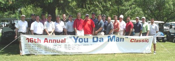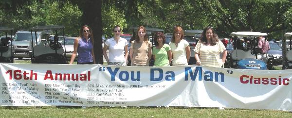 2007 "You Da Man" Top Ten...or so -------------------------------------------------- 13. Mulch (4 or 5 am): "I am going to climb the Obelisk" ... he didn't get up it very far 12. Tom to Michelle (Saturday am): "What is that on the floor?" Michelle: "Looks Like Spanish Rice." - we did eat Mexican food Friday 11. ACE: "Mount Everest is all I have left now." Michelle: "Make sure you take the cup and get a picture." 10. That's the price she (Lisa) pays for being married to DA MAN (prospect on ACE staying past midnight) 9. Mulch: "The sand looks inviting" (#6 Blue after several bad shots and one more tough one ahead) 8. Mulch (While adding 2007 to the You Not The Man pitcher) "Should I leave room for future years?" 7. Monk (on or about the first tee): "The Great Diner Flood of 2007 and Hurricane Katrina ... ... Not quite as big, but just as devastating." 6. (While in men's room at the Gaff) Sluz to T: "At some point everyone will win You Da Man." T's reply: "We would have to give Mulch a 50 Handicap ... And then he would win both." 5. Beth / Liz (about her mozerella balls): "I like the sticks better than the balls." 4. Melissa (about doing shots): "I can't open up my throat and get it all down." 3. T to Michelle on Friday night leaving the Gaff: (Michelle is plastered from tequilla shots): "What happened? I told you to take Monk out, not yourself". 2. After several sand shots # 8 Blue... Mulch was raking... Sluz : " Do you need a shovel?" Mulch: "It's a war zone" 1. Yanni & Michelle doing a shot for her birthday: Michelle: "I'll have a buttery nipple" Yanni: "I don't have to do one of those too?!" (note: The quotes written down at Saturday night "After-hours" were not recovered. If anyone remembers any quotes let us know they can be added easily)